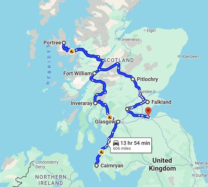 Llegada a Cairnryan, Escocia. El acento cambia, el paisaje también: más áspero, más salvaje, más vertical. Las Low lands (Tierras Bajas) escocesas nos reciben con colinas ondulantes, granjas de ovejas y muros de piedra seca que trepan por las pendientes.